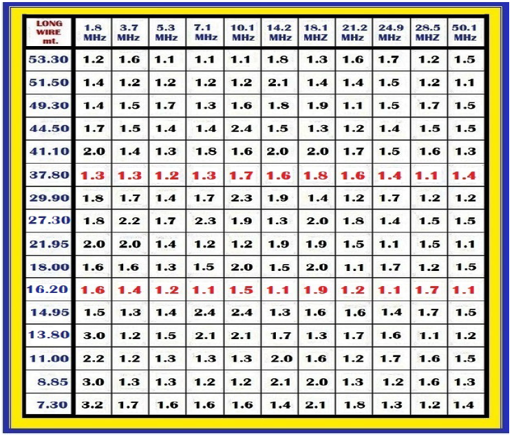 1. Cavo elettrico : Ci sono diverse misure (di seguito vi allego tabella misure con relativi SWR nelle varie bande). Quella che ho usato io è di 16,20 metri e di d: 2.5mm . Potreste usare anche cavo da 4mm, più il cavo ha sezione larga, più aumenta la portata dei Watt e più si allarga la banda nelle varie tarature. E’ anche vero però che 16.20 metri per un diametro di 4mm, diventa un pò pesante.